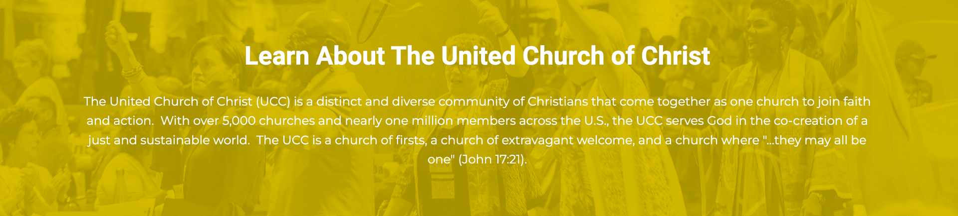 The United Church of Christ is an inclusive and diverse community of Christians connected by faith that calls us to build a just world for all.
